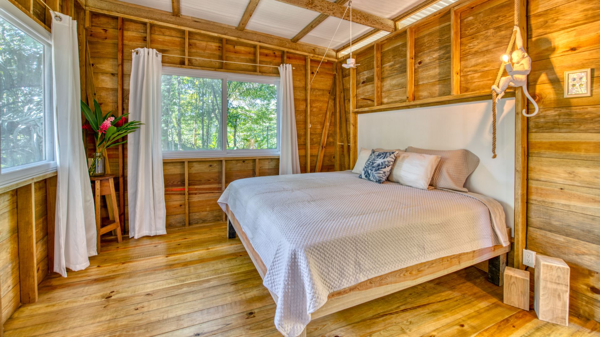 Cabane Toucan : Cette cabane est équipée d'un lit queen-size. Sur demande, nous pouvons ajouter des lits jumeaux pour accueillir une famille ou un groupe d'amis.